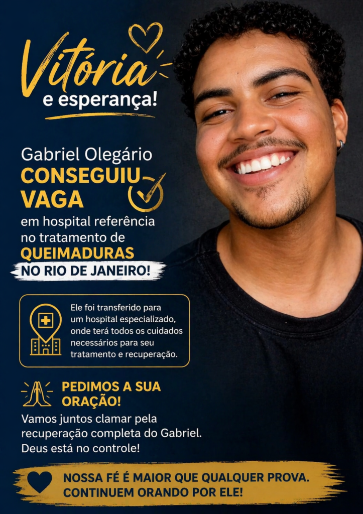Após grande mobilização de familiares, amigos e internautas, o jovem carangolense Valtencir Gabriel Olegário, de 21 anos, conseguiu transferência para o Hospital São Gonçalo, no estado do Rio de Janeiro, unidade reconhecida como referência no tratamento de queimaduras. No local, Gabriel já foi submetido a uma cirurgia que durou cerca de cinco horas. A transferência […]