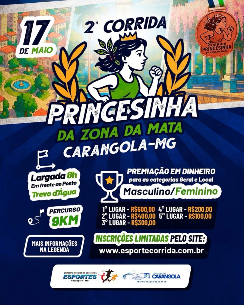 🏃♀️OLHA ELA AÍ DE NOVO: 2ª Corrida Princesinha da Zona da Mata! Após o sucesso da primeira edição, a Prefeitura de Carangola, por meio da Secretaria de Educação e Esportes, convida toda a população para mais uma manhã de esporte, saúde e integração pelas ruas da cidade. 📍 Largada às 8h, em frente ao Posto […]