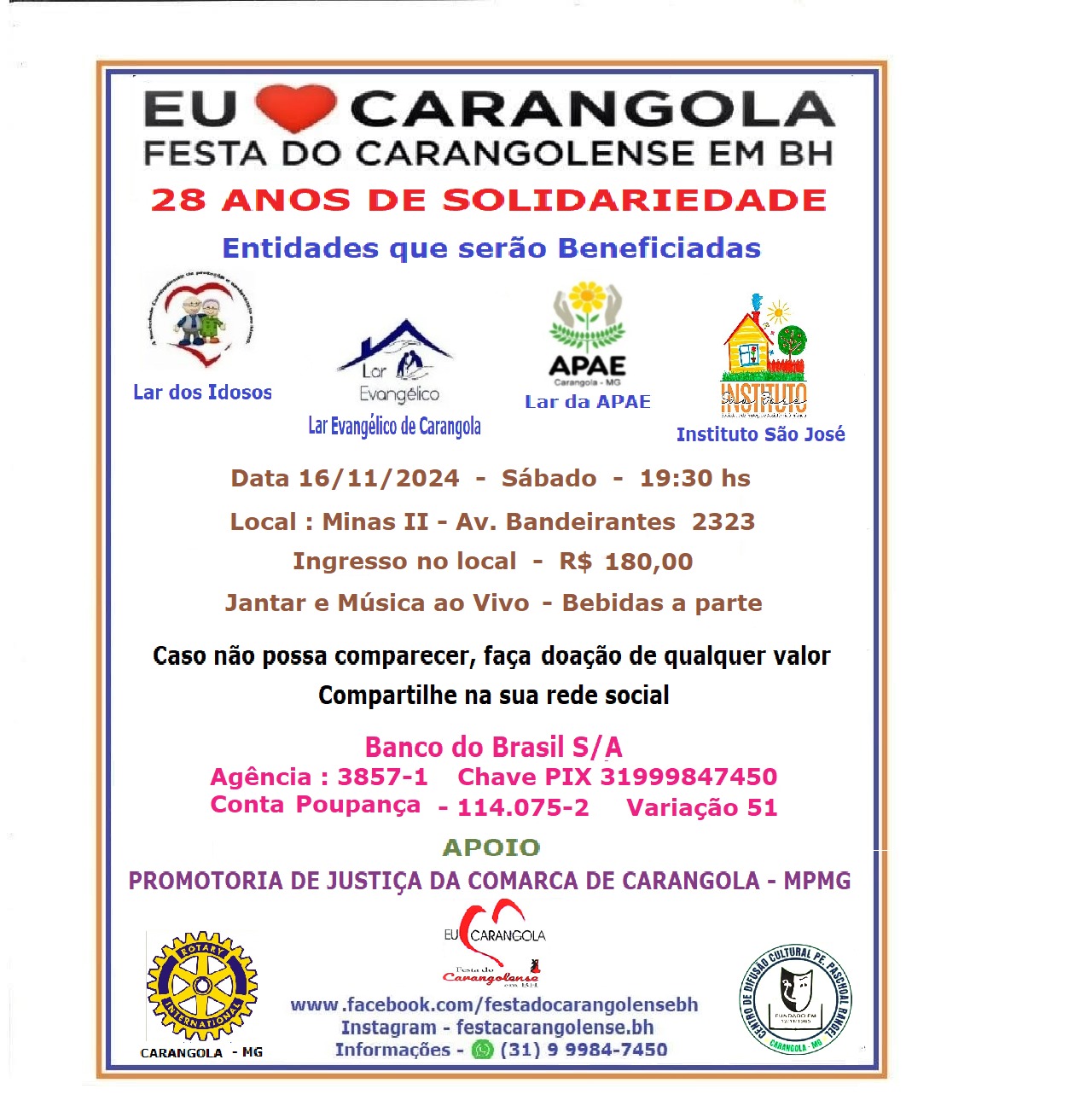 28ª EDIÇÃO DA FESTA DO CARANGOLENSE EM BH ACONTECERÁ NO DIA 16/11 NO RESTAURANTE MINAS II E VALOR ARRECADADO BENEFICIARÁ QUATRO ENTIDADES FILANTRÓPICAS DE CARANGOLA