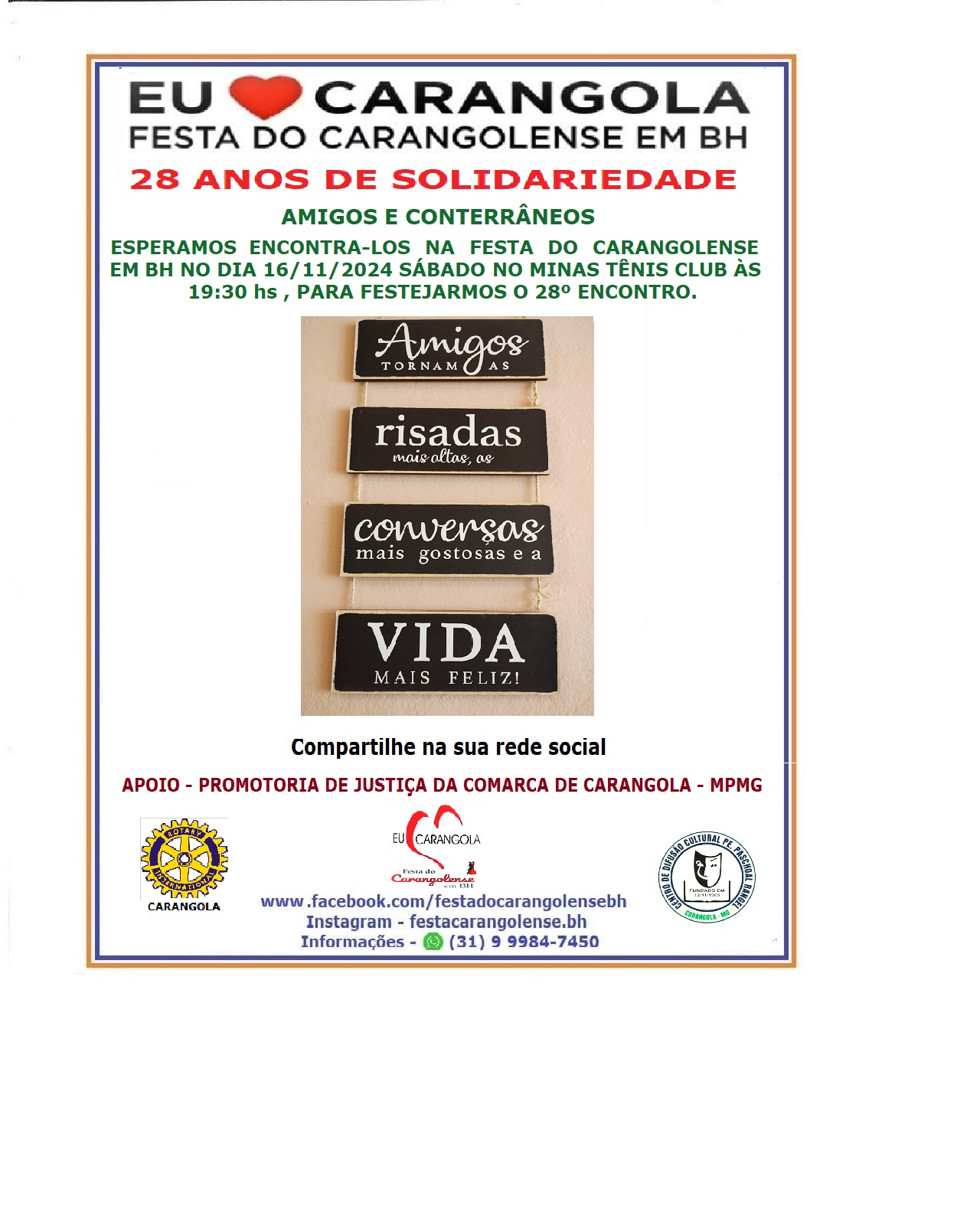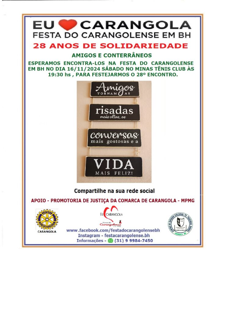 PARABÉNS AOS ORGANIZADORES DA FESTA DO CARANGOLENSE EM BH, SR. ANTÔNIO CARLOS E SRA. REGINA CELI, PELA 28ª EDIÇÃO DO EVENTO, QUE CERTAMENTE SERÁ UM SUCESSO COMO TODOS OS DEMAIS. O BELO EVENTO, ALÉM DE REUNIR AMIGOS, BENEFICIARÁ 4 ENTIDADES DO MUNICÍPIO! BRAVO!!!