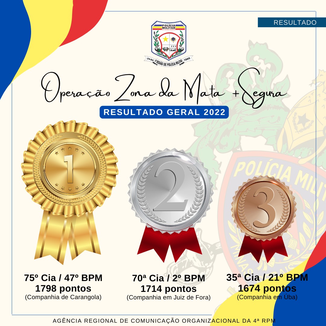 Neste ano aconteceu a Operação Zona da Mata + Segura, uma disputa saudável entre todas as cias PM das cidades que compõem a 4ª Região de Polícia Militar. Entre os critérios avaliados estava o cumprimento de mandado de prisões de foragidos da justiça, a prisão de traficantes de drogas, a diminuição de índices Criminais, entre outros critérios. A 75ª Cia PM, com sede em CARANGOLA e composta por 8 municípios em sua subárea (Carangola, Divino, Faria Lemos, Fervedouro, Pedra Dourada, São Francisco do Glória, Tombos e Orizânia), alcançou o 1° LUGAR GERAL ao final da disputa da Operação, que começou no início do ano, aferindo resultados mensalmente, e finalizou no mês de novembro/2022.