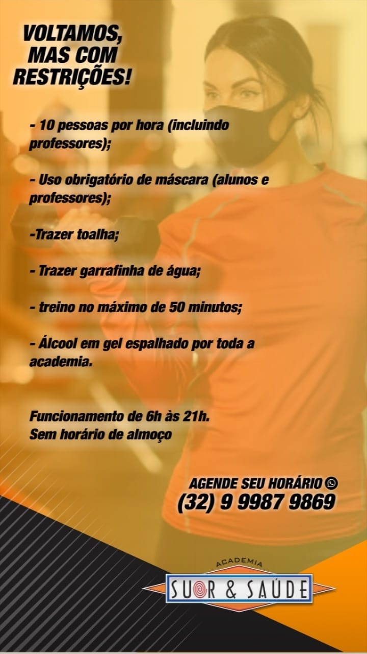 A Academia Suor & Saúde comunica a todos que, mediante a situação de pandemia, está funcionando, mas com restrições elencadas em Decreto Municipal.