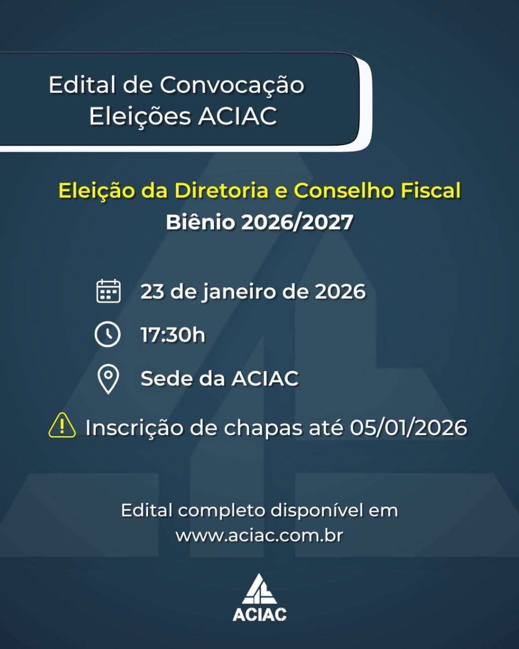 As eleições serão realizadas no dia 23 de janeiro de 2026, às 17h30, na sede da ACIAC.