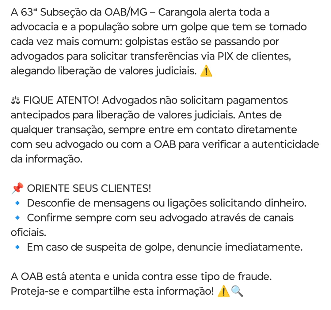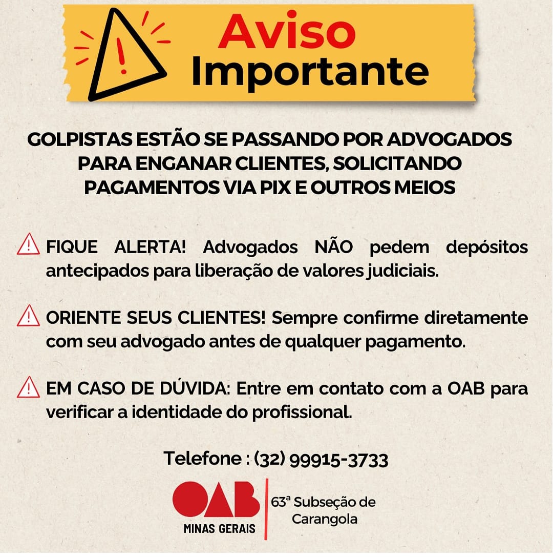 ALERTA DE GOLPE: INFRATORES ESTÃO SE PASSANDO POR ADVOGADOS E SOLICITANDO PAGAMENTOS VIA PIX E OUTROS MEIOS 18 de fevereiro de 2025 Fonte: OAB CARANGOLA