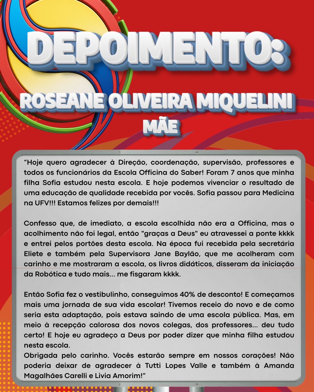 Em reconhecimento a essa trajetória de dedicação e sucesso, a mãe da aluna fez um belo e emocionante depoimento de agradecimento à Escola Officina do Saber, destacando o apoio, a excelência do ensino e o cuidado com a formação acadêmica e humana dos alunos. O público é convidado a ler e se inspirar com esse depoimento especial, que traduz a confiança das famílias no trabalho desenvolvido pela instituição.