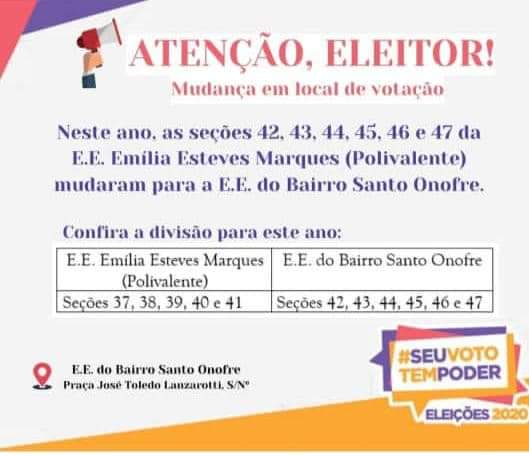 Houve mudanças de algumas seções da Escola Estadual Emília Esteves Marques (POLIVALENTE) para a Escola Estadual do Bairro Santo Onofre. CONFIRA: