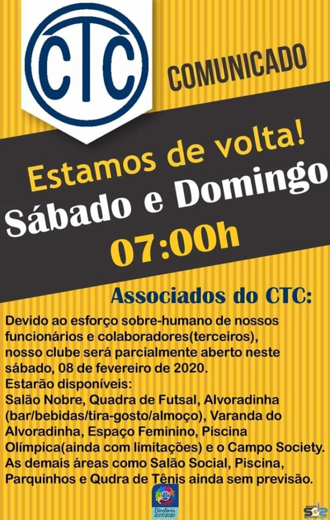 NOTA DO SITE: O CARANGOLA NOTÍCIAS parabeniza a todos os funcionários do CTC, que trabalharam bravamente para reconstruir o Clube após a enchente que afetou muito o CTC. Foram dias cansativos, pesados, e que vocês não desistiram, fazendo com que o Clube reabrisse, mesmo que parcialmente, em um tempo recorde. PARABÉNS A TODOS!!!