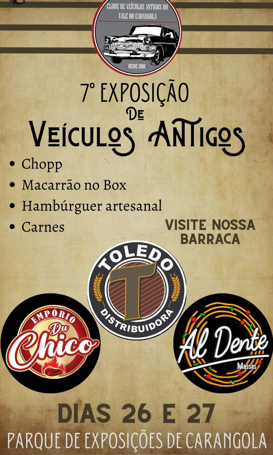 A Barraca “ TOLEDO DISTRIBUIDORA – EMPÓRIO DU CHICO – AL DENTE MASSAS“, após o SUCESSO NA EXPO CARANGOLA EM 2022, agora vai marcar a Exposição de veículos antigos de Carangola nesta sexta (26) e sábado (27), no parque de exposições de CARANGOLA, com O DELICIOSO MACARRÃO NO BOX, O DELICIOSO HAMBÚRGUER ARTESANAL, O MELHOR E MAIS GELADO CHOPP DO EVENTO, ALÉM DA MELHOR PORÇÃO DE CARNE!