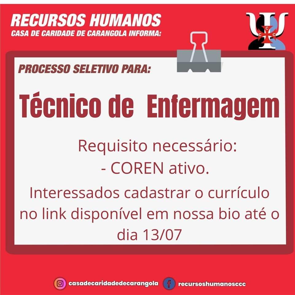 ATENÇÃO.Processo Seletivo para TÉCNICO DE ENFERMAGEM na Casa de Caridade de Carangola. Interessados cadastrar o currículo até o dia 13/07/2022 pelo link. https://docs.google.com/forms/d/e/1FAIpQLSd0m0PLERtnlWLVJnXRYMgFyYv1GU01SuODxbZYmu48zLVNiA/viewform