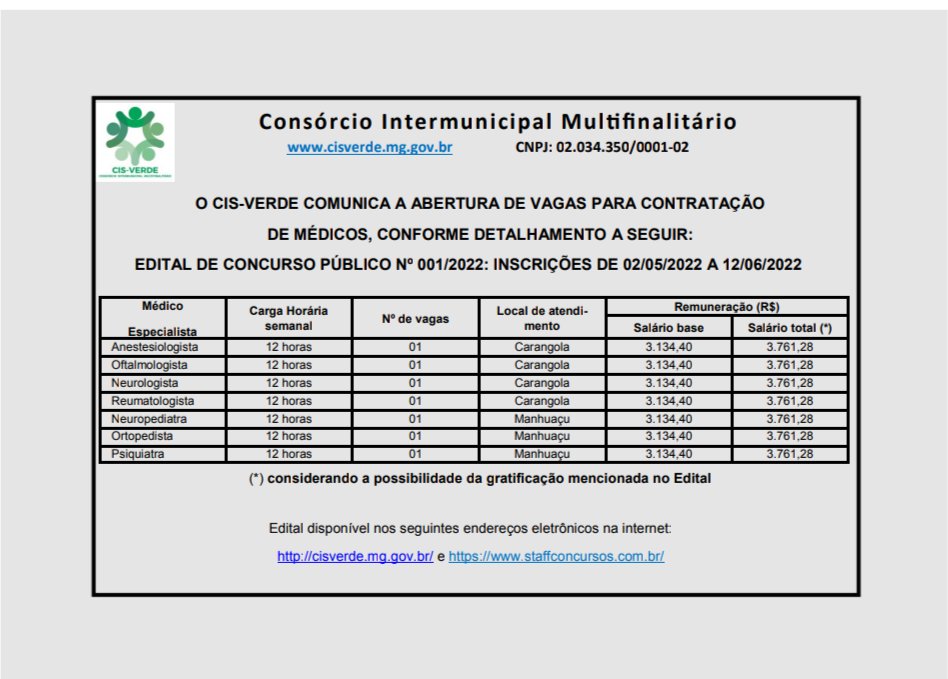 Vagas para Carangola e Manhuaçu. Para obter informações completas sobre o Concurso Público, acesse http://cisverde.mg.gov.br . Fonte: CIS-VERDE