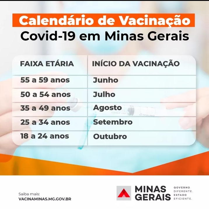 O Governo de Minas apresenta o calendário de vacinação contra a Covid-19 para todos os adultos mineiros. 💉 Acompanhe a maior operação de vacinação da história de Minas em vacinaminas.mg.gov.br