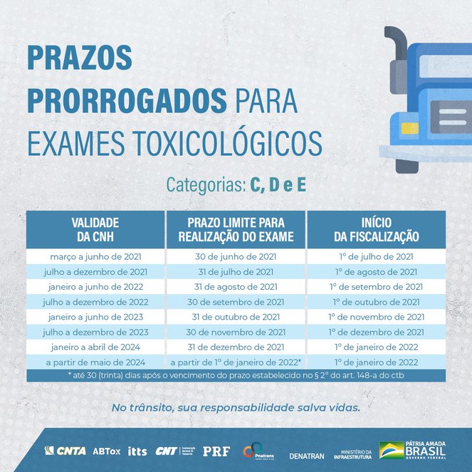 Por conta da pandemia de Covid-19, Contran estabeleceu novos prazos para realização do teste Conselho Nacional de Trânsito (Contran) prorrogou os prazos para a realização do exame toxicológico periódico para o condutor habilitado nas categorias C, D e E. Publicadas na edição desta quarta-feira, 28, do Diário Oficial da União (DOU), as novas datas foram […]