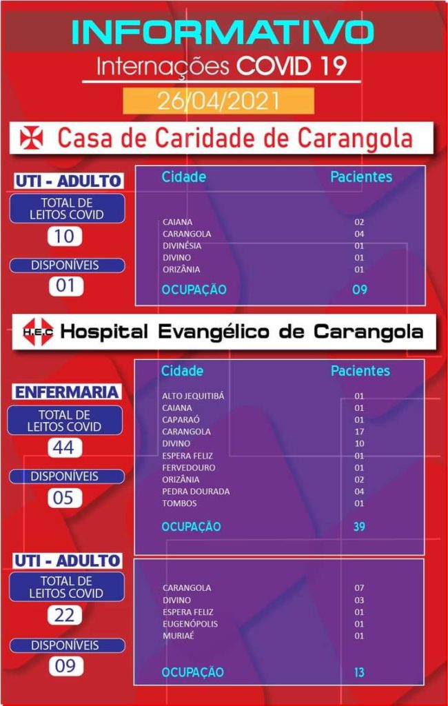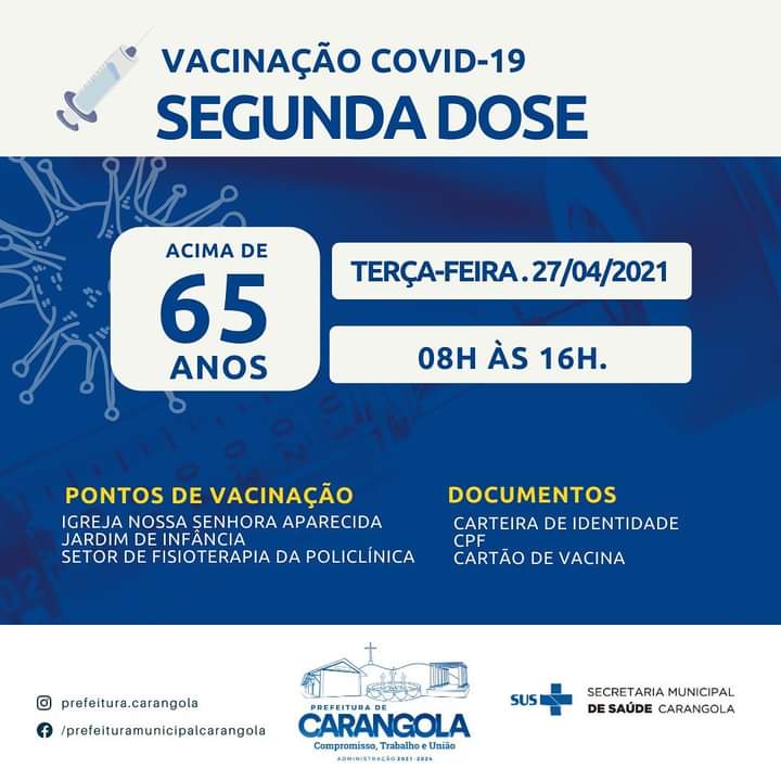 A Prefeitura de Carangola, através da Secretaria Municipal de Saúde, informa a segunda etapa de vacinação contra Covid-19, para pessoas acima de 65 anos. ➡️ VACINAÇÃO SEGUNDA DOSE COVID-19 Data: 27/04/2021, terça-feira; Idade: Pessoas acima de 65 anos; Horário: 8h às 16h; Locais: Jardim de Infância, Igreja Nossa Senhora Aparecida e Setor de Fisioterapia da […]