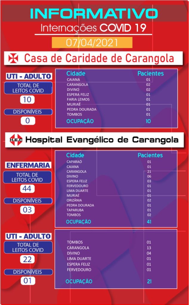 Dados informados conforme relatório do sistema de gestão hospitalar da Casa de Caridade de Carangola e Hospital Evangélico de Carangola.