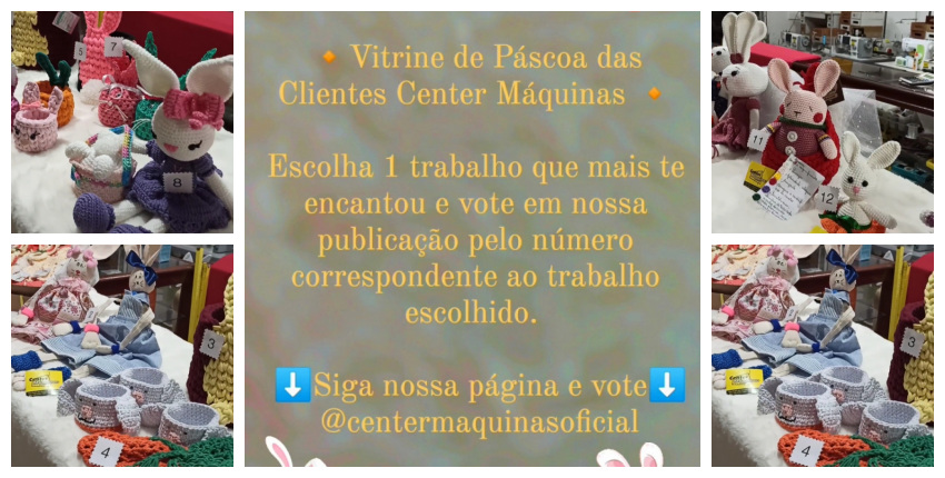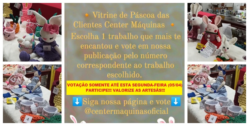 VOTAÇÃO DA “VITRINE DE PÁSCOA” DA LOJA CENTER MÁQUINAS SE ENCERRARÁ NESTA SEGUNDA-FEIRA (05/04); PARTICIPE VOTANDO NO MELHOR TRABALHO EM ARTESANATO NO INSTAGRAM OU FACEBOOK @CENTERMAQUINASOFICIAL