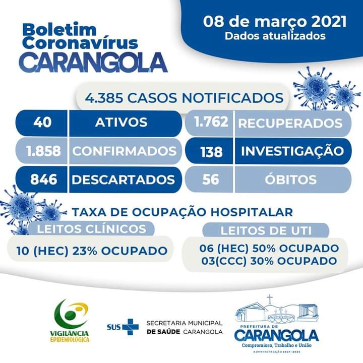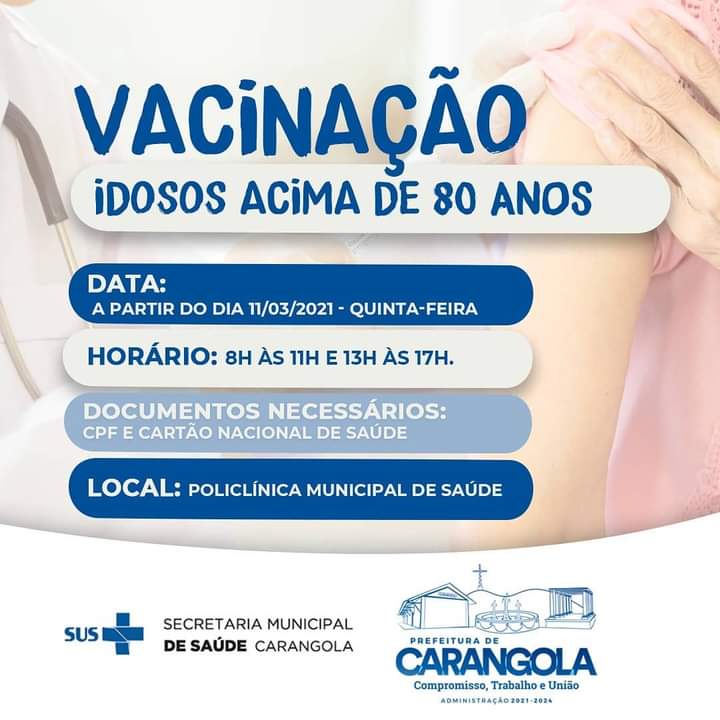 A Prefeitura de Carangola, através da Secretaria Municipal de Saúde, informa que a partir desta quinta- feira, dia 11/03/2021 começa a vacinação para idosos acima de 80 anos. Os idosos com 80 anos ou mais, deverão ir até a Policlinica Municipal de Saúde, portando CPF e Cartão Nacional de Saúde para receber a vacina. Fonte: […]