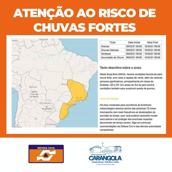 A Prefeitura de Carangola, através da Defesa Civil alerta sobre a possibilidade de chuvas fortes nas próximas 24 horas. Segundo o alerta emitido hoje pelo INPE/CPTEC podem ocorrer chuvas fortes e intensas na região da Zona da Mata. Pedimos a toda população que permaneça em alerta e em qualquer situação de emergência entre em contato […]