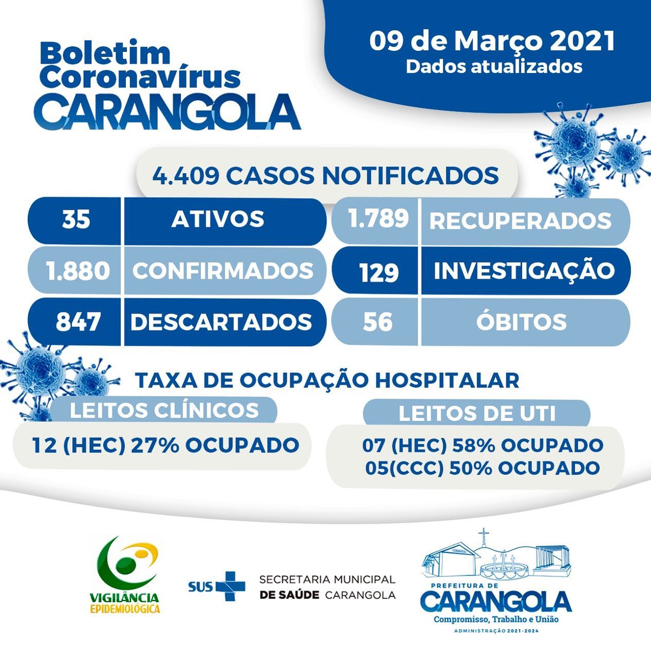 CAI PARA 35 OS CASOS ATIVOS DE CORONAVÍRUS EM CARANGOLA; CARANGOLENSES PRECISAM CONTINUAR COM MEDIDAS PREVENTIVAS À COVID-19 10 de março de 2021 FONTE: PREFEITURA DE CARANGOLA