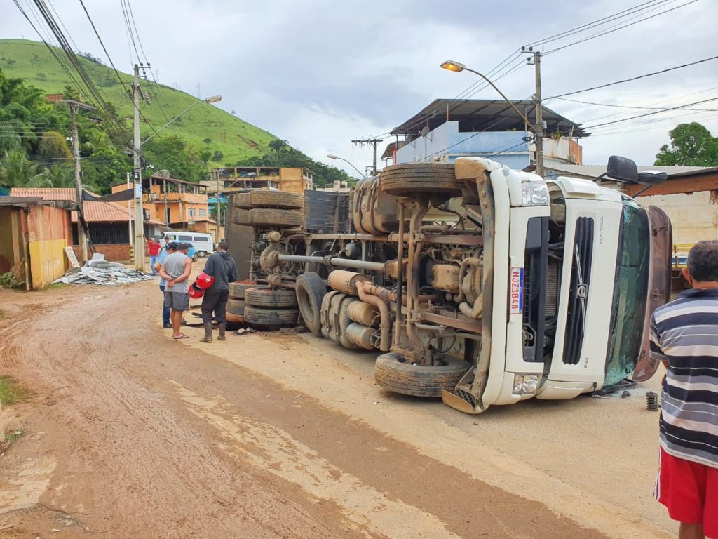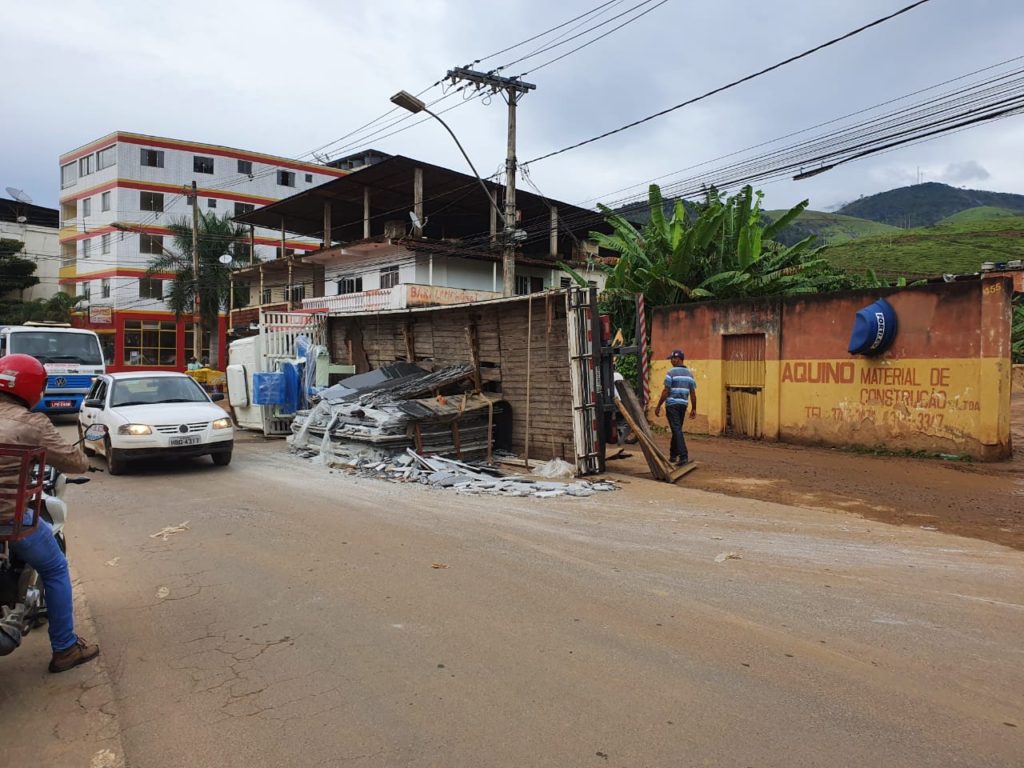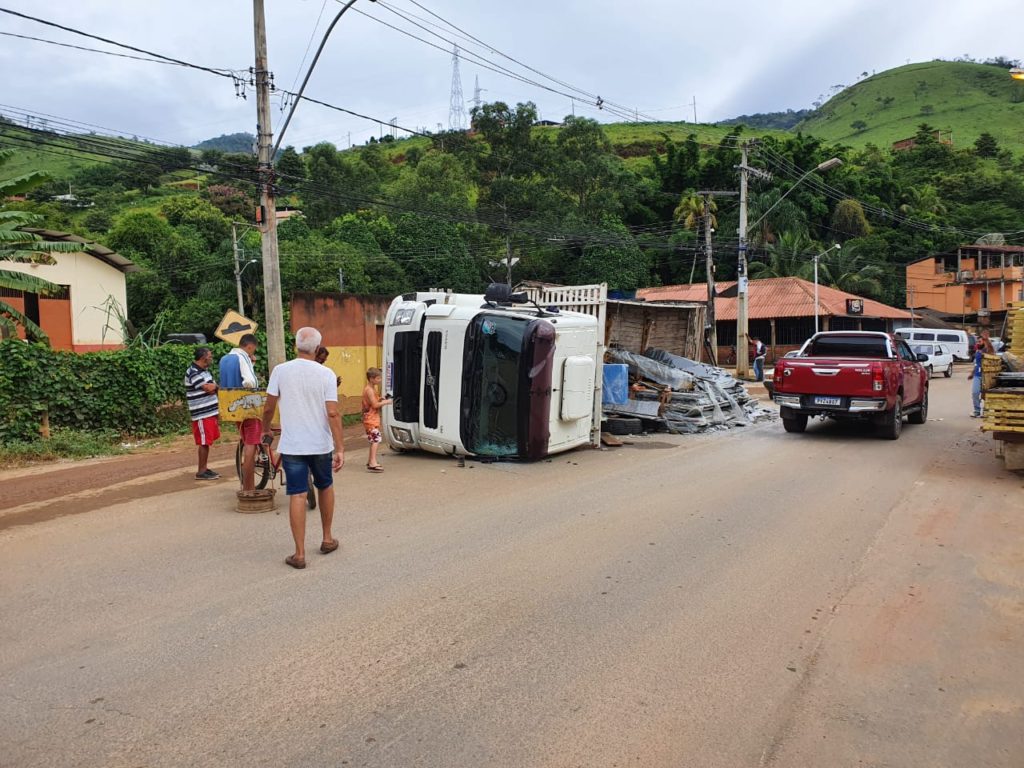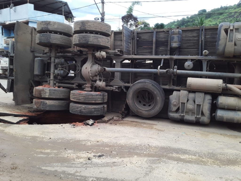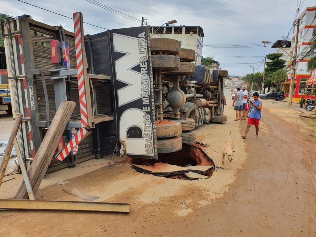 CAMINHÃO DE PEDRAS TOMBA EM CARANGOLA APÓS ABERTURA DE UM BURACO NO ASFALTO NA AVENIDA CAPITÃO ANTÔNIO CARLOS DE SOUZA
