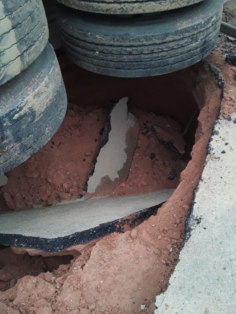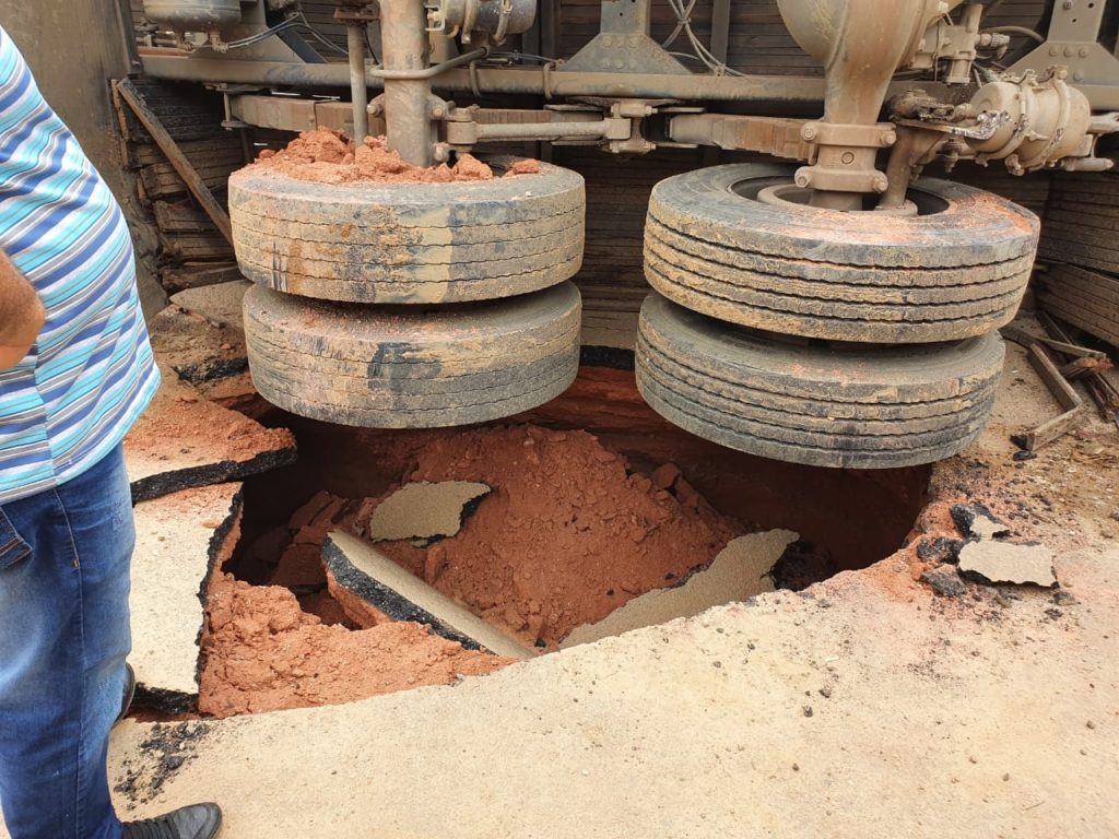 Provavelmente o peso do caminhão somado aos efeitos da enchente no solo danificando-o pode ter causado a abertura do buraco e o acidente. A princípio, ninguém se feriu.