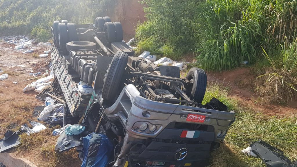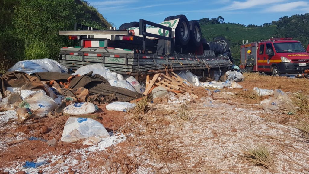 O caminhão carregado com polietileno descia a rodovia no sentido Caratinga – Manhuaçu quando o motorista perdeu o controle da direção e tombou na curva. O veículo parou com as rodas para o alto.