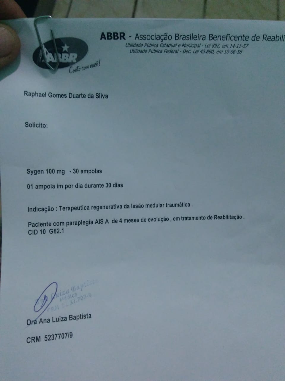 Na ABBR recebeu a indicação da necessidade do uso do medicamento SYGEN em 30 ampolas e amigos e familiares promovem ação para ajudá-lo a comprar o medicamento. O plano de saúde não cobre esse medicamento e amigos e familiares se unem para ajudar. O custo total de todo o tratamento é de cerca de R$8.000,00. Com esse medicamento irá auxiliar na regeneração medular traumática.
