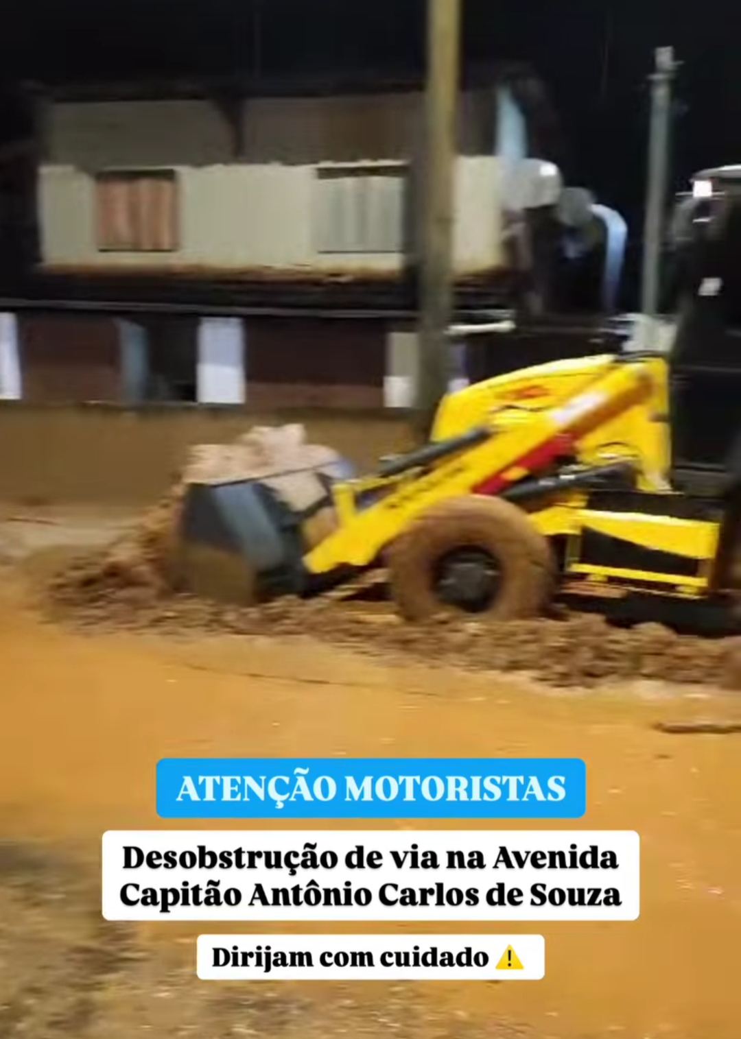 A avenida Capitão Antônio Carlos de Souza, próximo ao Trevo, ficou cheia de lama, sendo necessária uma máquinas da Prefeitura de Carangola para desobstruir a viatura ainda na madrugada.