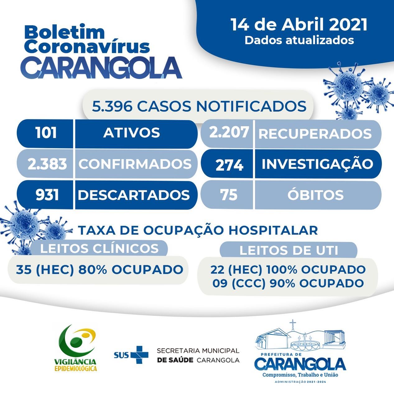 CARANGOLA CONFIRMA MAIS DOIS ÓBITOS POR CORONAVÍRUS NESTA QUARTA-FEIRA (14) 14 de abril de 2021 FONTE: Prefeitura de Carangola