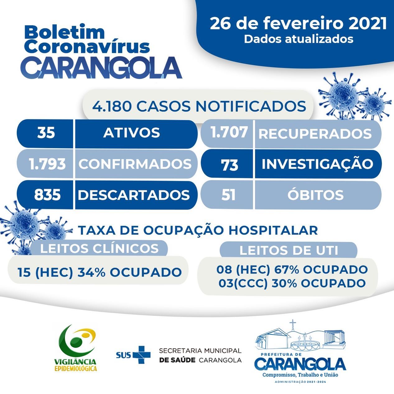 CARANGOLA FECHA A SEMANA COM 35 CASOS ATIVOS DE CORONAVÍRUS E MAIS 01 ÓBITO CONFIRMADO PELA DOENÇA 27 de fevereiro de 2021 FONTE: PREFEITURA DE CARANGOLA