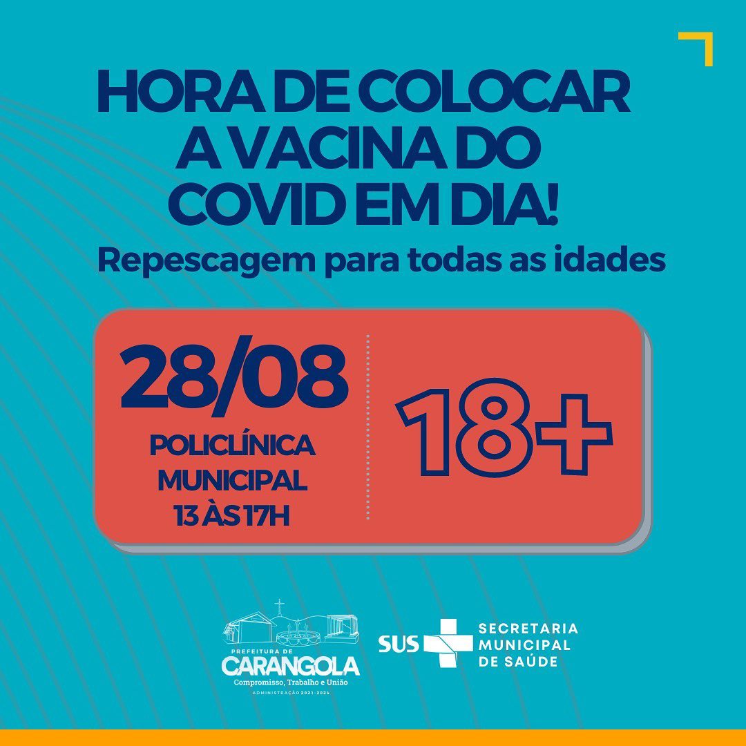 A VACINAÇÃO DE REPESCAGEM DA 1ª DOSE ACONTECERÁ NA POLICLÍNICA MUNICIPAL DE CARANGOLA DAS 13H ÀS 17H PARA QUALQUER IDADE A PARTIR DOS 18 ANOS.