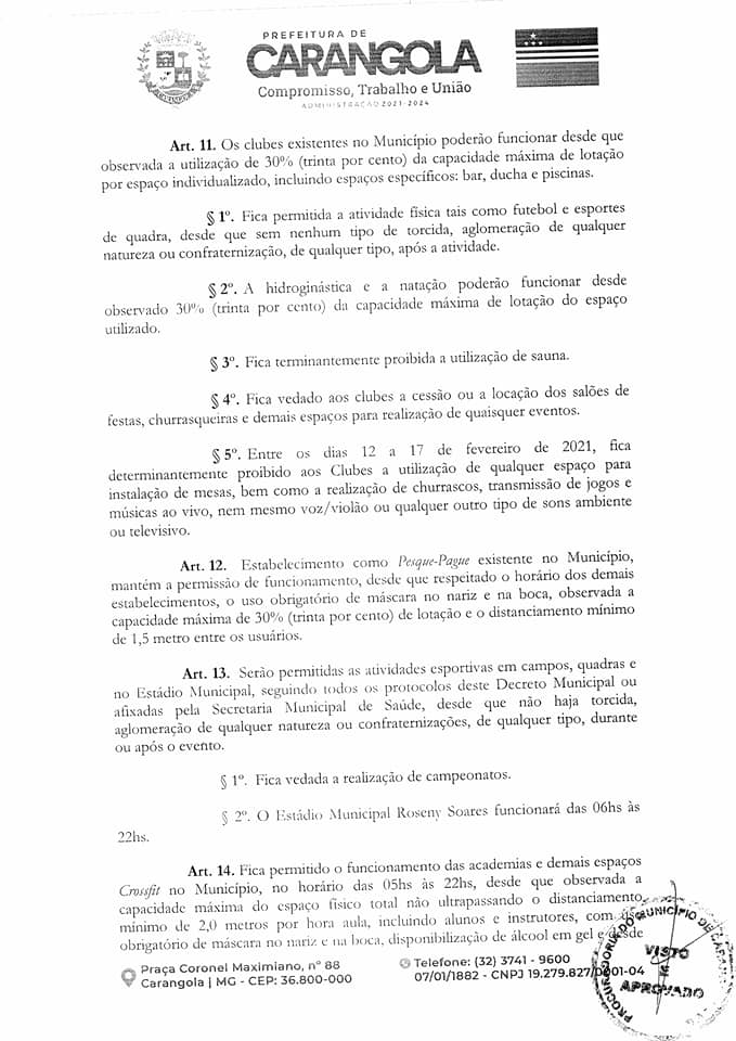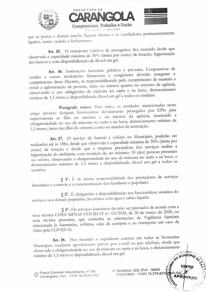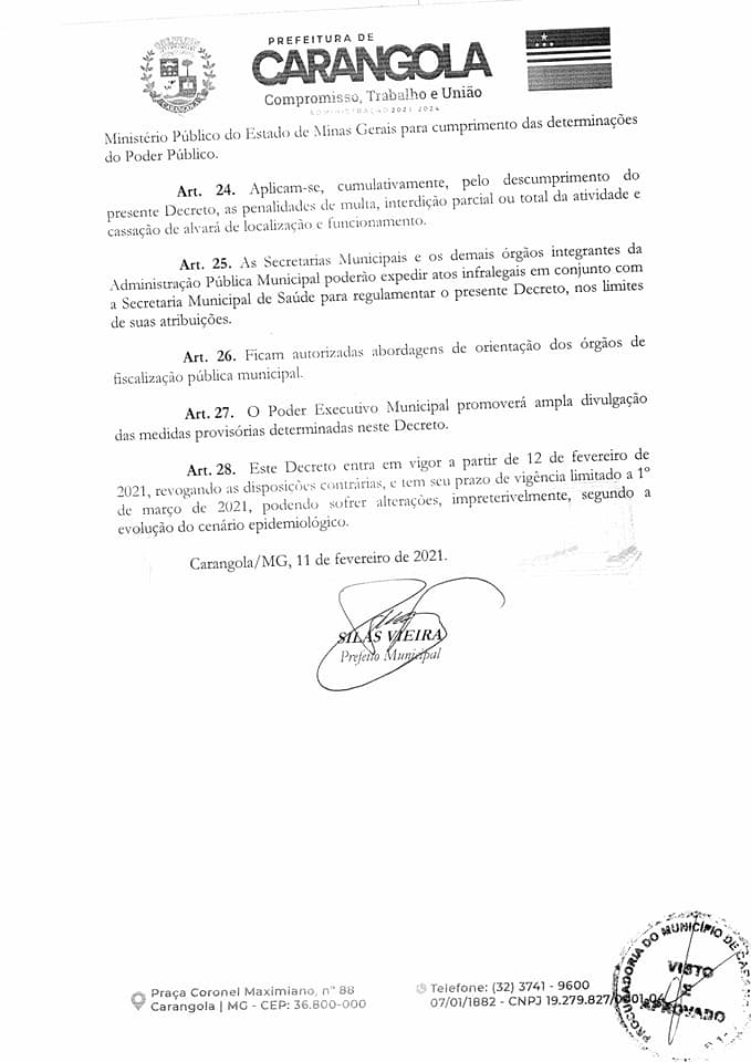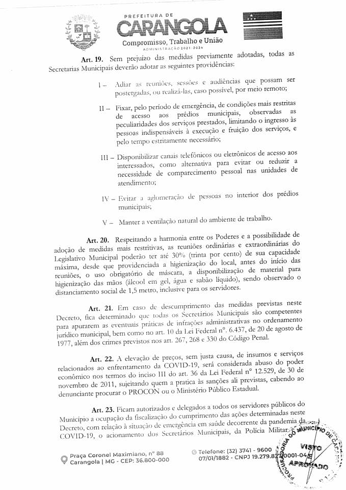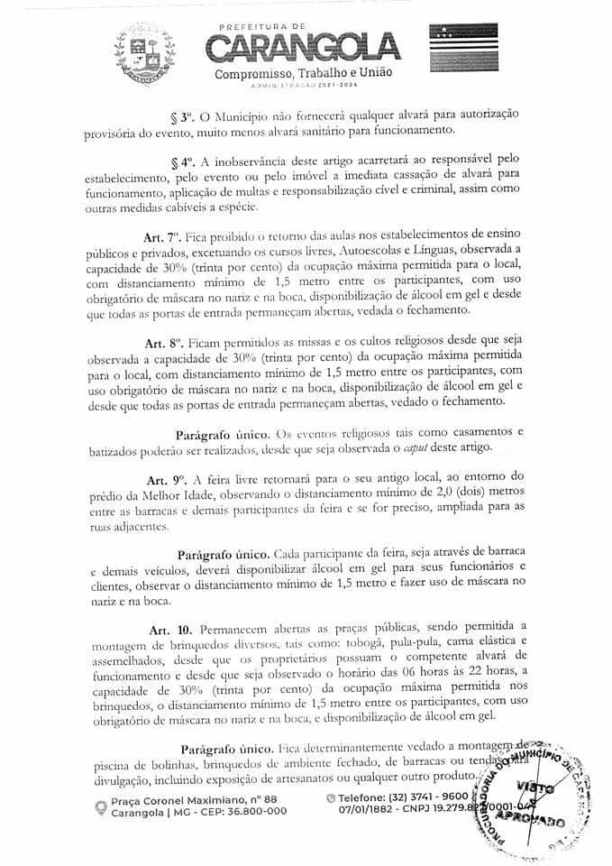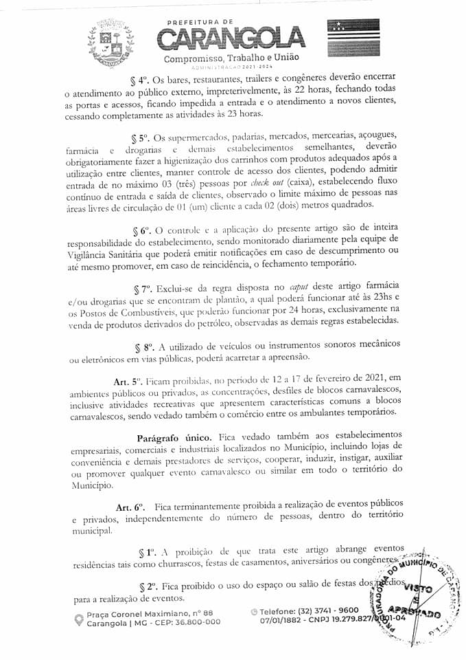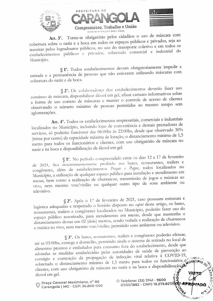 CARANGOLA: NOVO DECRETO MUNICIPAL PROLONGA ABERTURA DO COMÉRCIO NOTURNO ATÉ 22H, MAS ESTABELECE INÚMERAS PROIBIÇÕES SOB PENA DE MULTA, SUSPENSÃO DE ATIVIDADES E ATÉ CASSAÇÃO DE ALVARÁ