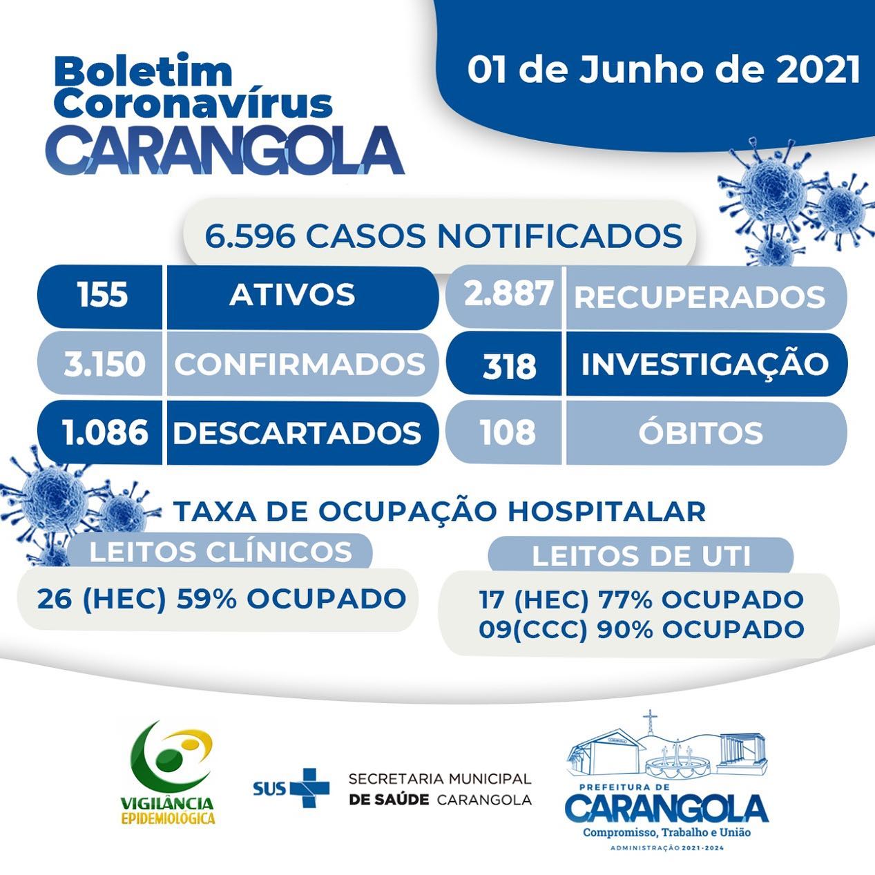 CARANGOLA POSSUI 155 CASOS ATIVOS DE CORONAVÍRUS E 318 EM INVESTIGAÇÃO 2 de junho de 2021 FONTE: Prefeitura de Carangola