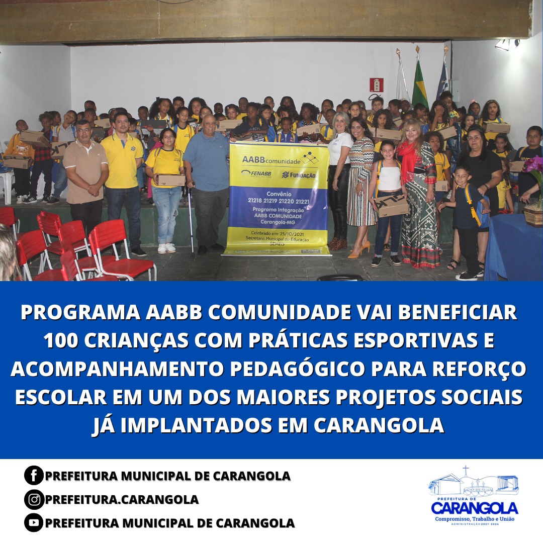 Aconteceu na tarde do ultimo sábado (18/06) no salão da Associação Atlética do Banco do Brasil, a solenidade de abertura do Programa “AABB COMUNIDADE” em parceria com a Prefeitura de Prefeitura de Carangola, através da Secretaria de Educação e a Federação Nacional das AABBs que foi assinado em 25/10/2021 e agora tem o seu início oficial depois de todos os trâmites necessários para a sua implantação.