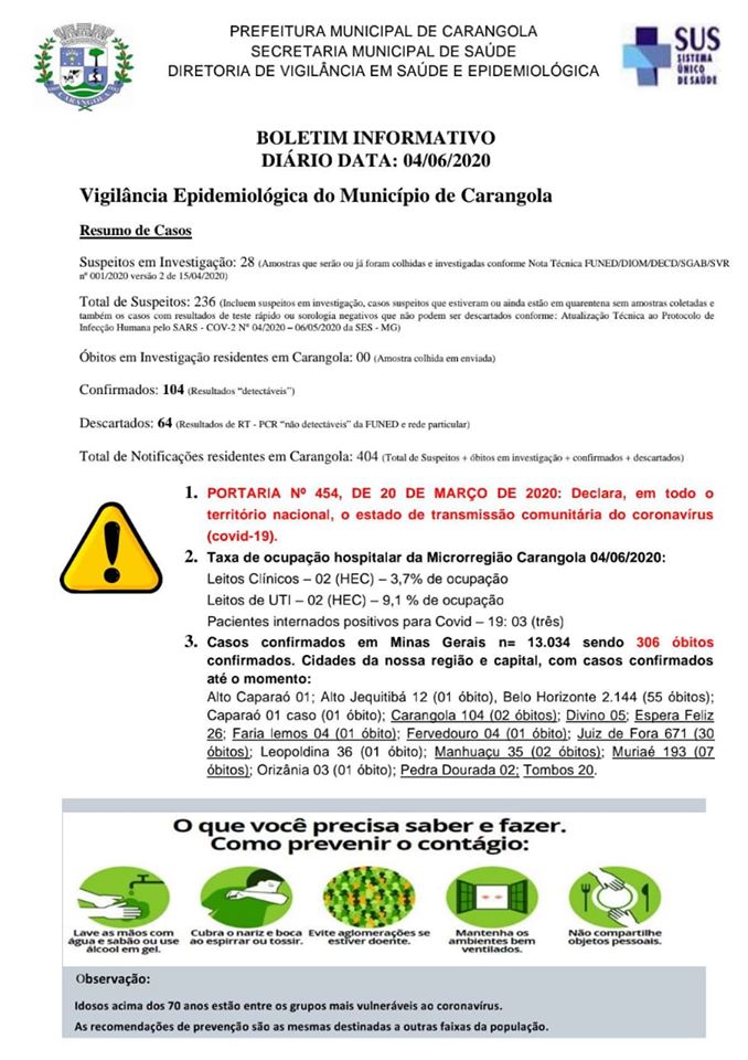 Suspeitos em Investigação: 28 (Amostras que serão ou já foram colhidas e investigadas conforme Nota Técnica FUNED/DIOM/DECD/SGAB/SVR nº 001/2020 versão 2 de 15/04/2020). Total de Suspeitos: 236 (Incluem suspeitos em investigação, casos suspeitos que estiveram ou ainda estão em quarentena sem amostras coletadas e também os casos com resultados de teste rápido ou sorologia negativos que não podem ser descartados conforme: Atualização Técnica ao Protocolo de Infecção Humana pelo SARS – COV-2 N° 04/2020 – 06/05/2020 da SES – MG). Óbitos em Investigação residentes em Carangola: 00 (Amostra colhida em enviada). Confirmados: 104 (Resultados “detectáveis”). Descartados: 64 (Resultados de RT – PCR “não detectáveis” da FUNED e rede particular). Total de Notificações residentes em Carangola: 404 (Total de Suspeitos + óbitos em investigação + confirmados + descartados).