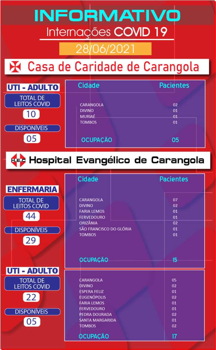 CARANGOLA TEM LIGEIRA QUEDA NA OCUPAÇÃO DOS LEITOS COVID-19 NOS HOSPITAIS CASA DE CARIDADE E EVANGÉLICO; CLIQUE E CONFIRA