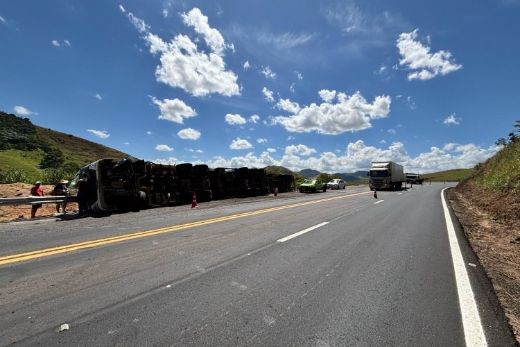 Uma carreta do tipo nove eixos tombou no KM 688 da BR-116, próximo ao distrito de Itamuri. O veículo transportava dois contêineres carregados que resistiram ao impacto e não se romperam.