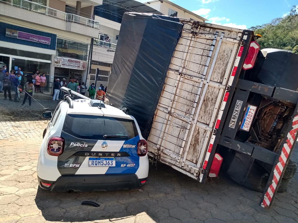 Nesta segunda-feira (26), após uma manobra, uma carreta tombou em cima de uma viatura da Polícia Militar do Espírito Santo no município de Dores do Rio Preto-ES. Graças a Deus ninguém se feriu no acidente, havendo apenas danos materiais.