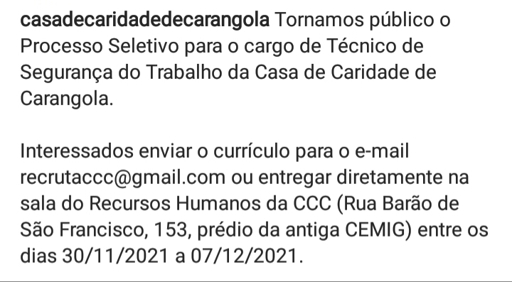 CASA DE CARIDADE DE CARANGOLA ANUNCIA PROCESSO SELETIVO PARA O CARGO DE TÉCNICO DE SEGURANÇA DO TRABALHO 5 de dezembro de 2021 Fonte: RH da Casa de Caridade de Carangola.