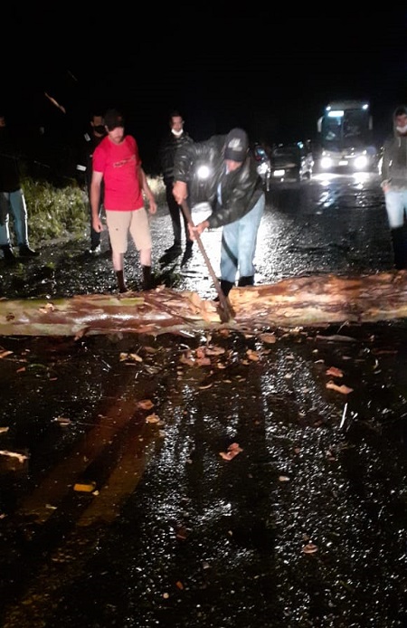 O motorista de plantão e o amigo tiveram que cortar o tronco com um machado. Mediram 5 metros que daria passagem para a ambulância e demais veículos.