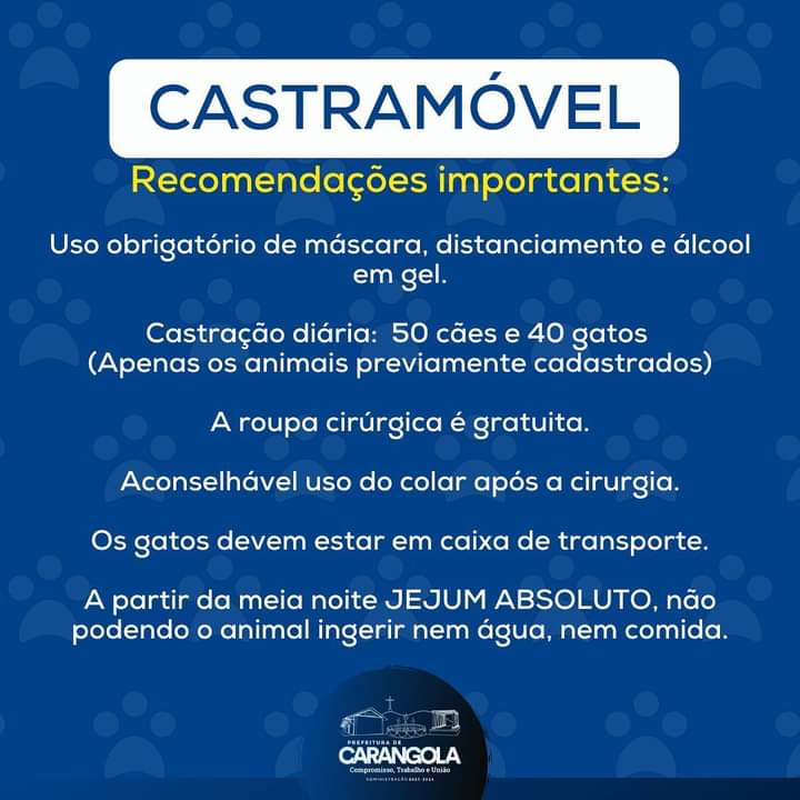 CASTRAMÓVEL COMEÇARÁ CASTRAÇÃO DE GRATUITA DE CÃES E GATOS NESTA TERÇA-FEIRA (15) NA QUADRA DO IBC EM CARANGOLA; SOMENTE SERÃO ESTERILIZADOS ANIMAIS CADASTRADOS NO MÊS DE MARÇO DO CORRENTE