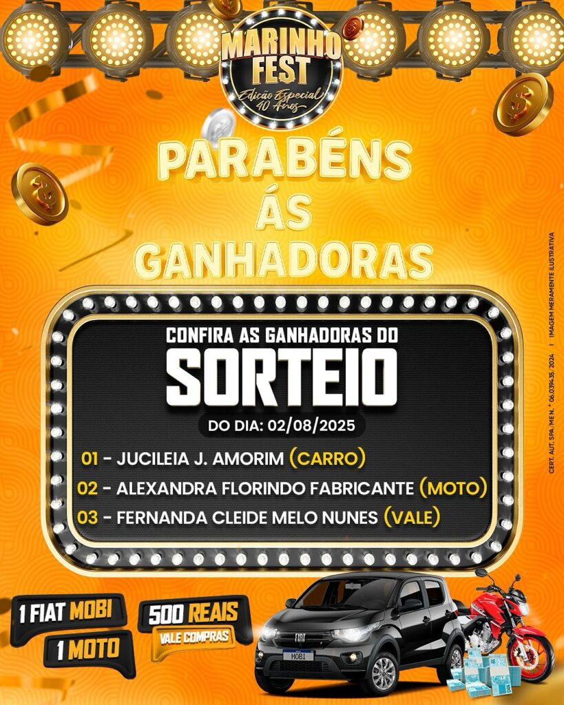 Parabéns as ganhadoras do último sorteio da Super Promoção Marinho Fest – Edição Especial! No dia 02/08, três sortudas levaram para casa um Fiat Mobi 0km, uma moto Yamaha 0km e R$500,00 em vale-compras. Os Supermercados Marinho agradecem a todos que participaram e confiaram. Em breve, tem mais!