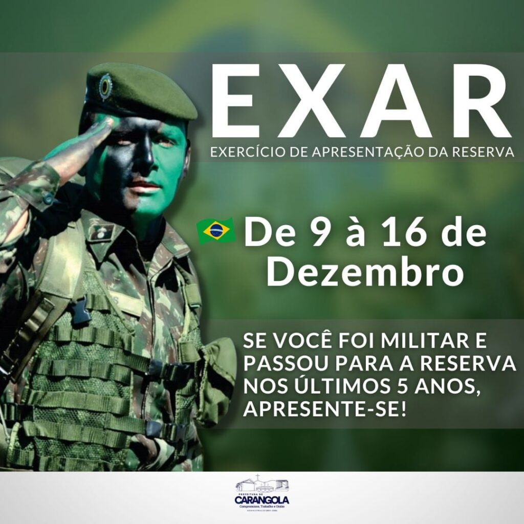 A Junta de Serviço Militar de Carangola comunica aos reservistas que os mesmos devem comparecer na Junta de Serviço Militar ou em qualquer Unidade do Exército Brasileiro de 9 a 16 de dezembro, munido do seu Certificado de Reservista para participar do EXAR – Exercício de Apresentação da Reserva. Conforme a Junta, devem comparecer todos […]