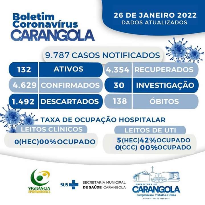 CARANGOLA CHEGA A 132 CASOS ATIVOS DE COVID-19 E 30 CASOS EM INVESTIGAÇÃO