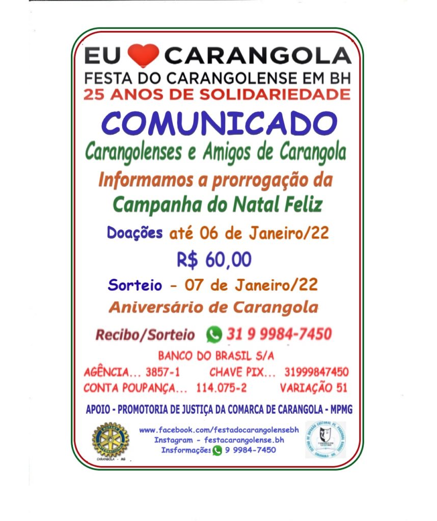 Os organizadores da FESTA DO CARANGOLENSE EM BH, Antônio Carlos e Regina Celi, juntamente com diversos parceiros, estão realizando uma CAMPANHA DE NATAL com a arrecadação de fundos para beneficiar cinco entidades carangolenses. AS DOAÇÕES PODERÃO SER FEITAS ATÉ O DIA 6 DE JANEIRO DE 2022 E O SORTEIO ACONTECERÁ EM 07 DE JANEIRO DE 2022. PARTICIPE! […]