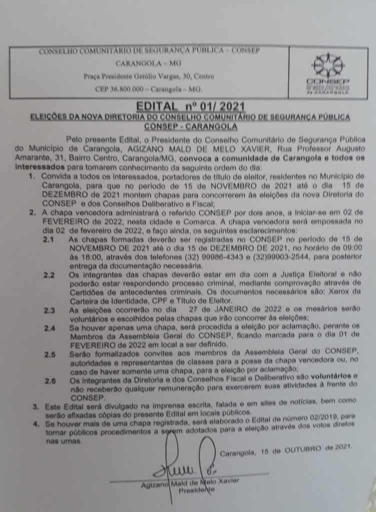 O CONSEP – CONSELHO COMUNITÁRIO DE SEGURANÇA PÚBLICA de Carangola torna público o edital acima para formação de chapa para a eleição da nova diretoria. Confira detalhes na íntegra no próprio Edital 01/2021. Para maiores informações entre em contato através dos telefones 32 99986-4343 ou 32 99903-2545.