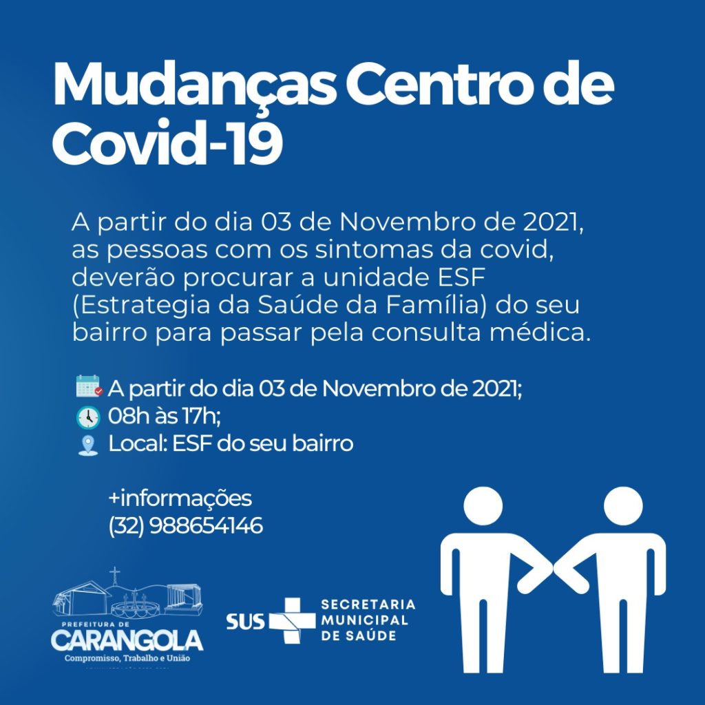 A Secretaria Municipal de Saúde comunica a todos os cidadãos carangolenses que a partir do dia 03 de Novembro encerra-se as atividades do Centro COVID-19 localizado na Policlínica Municipal. A partir dessa data todas as pessoas com sintomas de COVID-19 deverão procurar a Unidade ESF(Estratégia da Saúde da Família) do seu bairro para os procedimentos […]