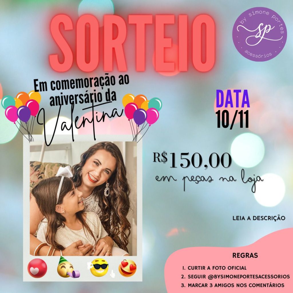 A LOJA BY SIMONE PORTES ACESSÓRIOS VAI COMEMORAR O ANIVERSÁRIO DA @valentinaoportes E QUEM GANHA O PRESENTE É VOCÊ!Isso mesmo! Você pode ganhar um vale compras de R$ 150,00 em compras na @bysimoneportesacessorios . PARA PARTICIPAR É MUITO SIMPLES! BASTA SEGUIR AS REGRAS:1- curtir a foto oficial no instagram (FOTO: https://www.instagram.com/p/CU2bnqiFNjp/)2- seguir o perfil no instagram @bysimoneportesacessorios3- marcar três amigas […]