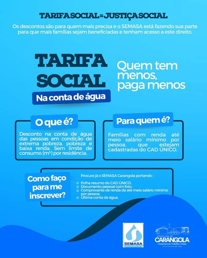 NOTA DE UTILIDADE PÚBLICA Chegou a tarifa social do SEMASA, ela veio pra fazer justiça social. Com ela, quem tem menos, paga menos. Procure o SEMASA imediatamente munido dos seguintes documentos para a realização de cadastro: 1️⃣ Folha resumo do CAD ÚNICO; 2️⃣ Documento pessoal com foto; 3️⃣ Comprovação de renda familiar até meio salário […]