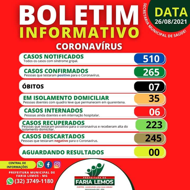 Vale ressaltar que a cidade de Faria Lemos está proporcionalmente com um nível alto de infectados com a covid-19, mesmo após aceleração da vacinação. Fonte (boletim): Prefeitura de Faria Lemos