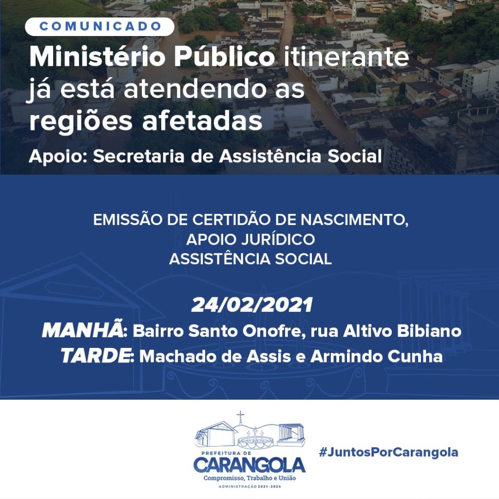 Ministério público itinerante estará em Carangola nos dias de 23 a 26 de fevereiro. Em parceria com o instituto de registro civil, uma van do Ministério Público estará em circulação nos bairros atingidos pela enchente, com a presença de servidores e/ou membros, para atender a comunidade prestando orientação jurídica à população e viabilizando a obtenção […]